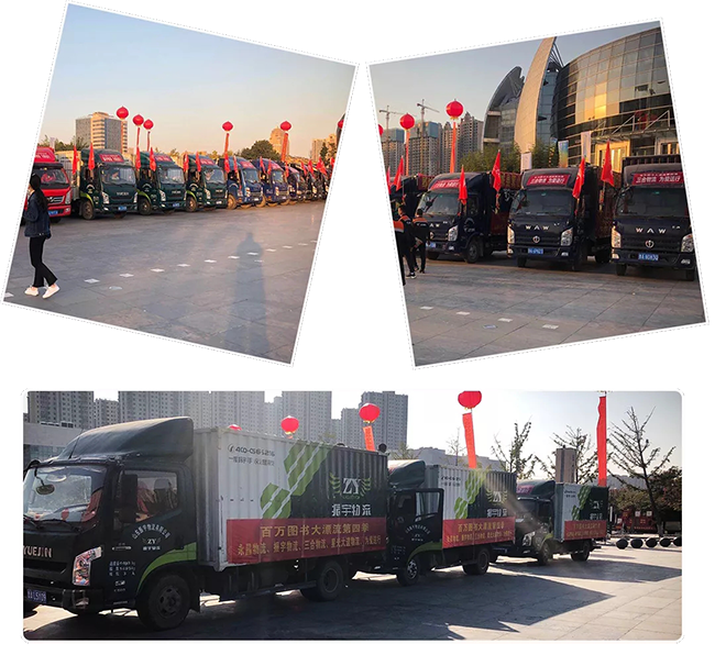 振宇物流積極捐贈(zèng)圖書,為愛護(hù)航 ,通過(guò)自己的方式和力量,助力百萬(wàn)圖書大漂流!現(xiàn)場(chǎng)物流車輛整齊排開,氣勢(shì)如虹……