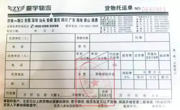 1、我公司發(fā)貨都有統(tǒng)一的發(fā)貨單,并印有振宇物流公司的公章。