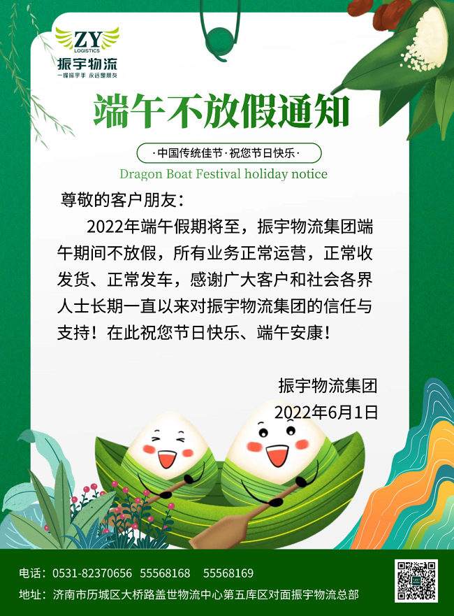 2022年端午假期將至,振宇物流集團(tuán)端午期間不放假,所有業(yè)務(wù)正常運(yùn)營,正常收發(fā)貨、正常發(fā)車,感謝廣大客戶和社會(huì)各界人士長期一直以來對(duì)振宇物流集團(tuán)的信任與支持!在此祝您節(jié)日快樂、端午安康!