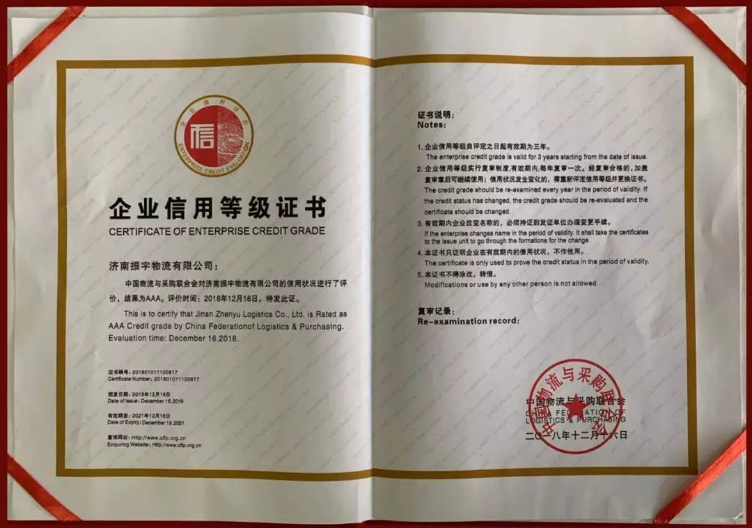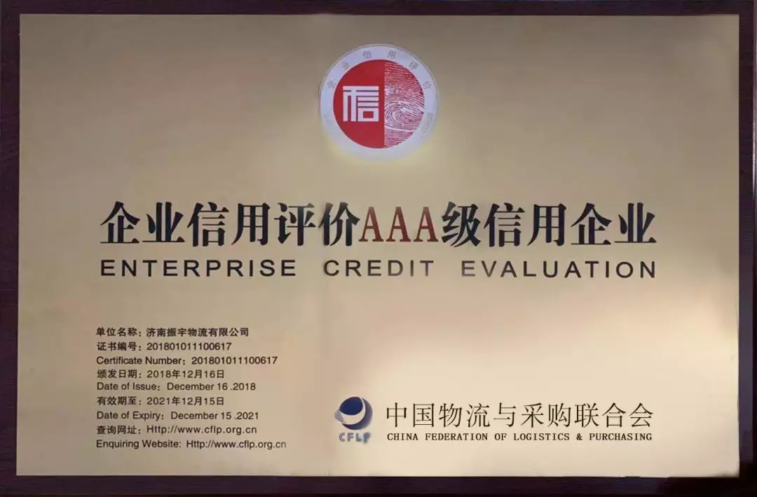 濟(jì)南振宇物流有限公司:國家3A級信用企業(yè)