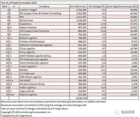 7月11日消息,第三方物流咨詢機構(gòu)Armstrong&Associates.Inc發(fā)布了最新的2022年航空貨代TOP25排名。前25家空運貨代公司的總貨量同比下降了6.3%,達到1690萬噸。其中,前五名延續(xù)去年的排名,分別為德迅(K+N)、DHL、DSV、DB Schenker、Expeditors。德迅憑借223萬噸的空運貨量,進一步擴大了對DHL的領(lǐng)先優(yōu)勢,再次成為全球最大航空貨運代理公司。排名第二的DHL去年空運貨物量下降了9.3%,達到190萬噸,反映出了整體空運貨代市場的情況。